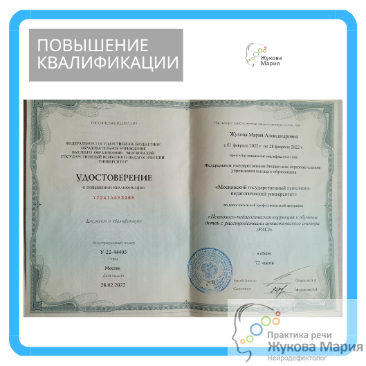 В феврале 2022 была слушателем курсов повышения квалификации в «Московском Государственном психолого-педагогическом Университете» Федеральном ресурсном центре (Москва, Кашенкин луг, 7) по организации комплексного сопровождения детей с расстройствами аутистического спектра по программе «Психолого-педагогическая коррекция и обучение детей с расстройствами аутистического спектра (РАС)».