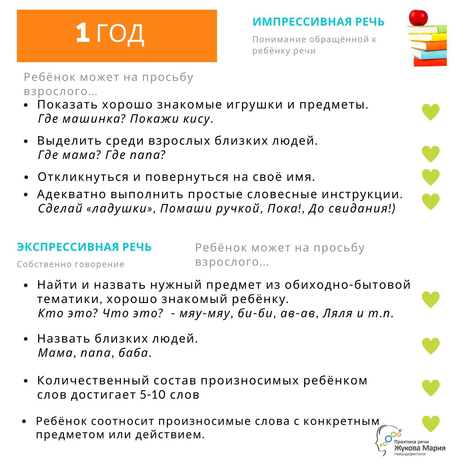 КАКИЕ ПОКАЗАТЕЛИ? Так как речь это высшая психическая функция, мы предлагаем вам пройти Чек-лист показателей нервно-психического развития ребёнка 1 года, состоящего из речевых компетенций: импрессивной речи (понимания ребёнком обращённой к нему речи) и экспрессивной речи (собственно говорения) - это самое показательное, что вы можете оценить самостоятельно в процессе общения и игр с малышом.