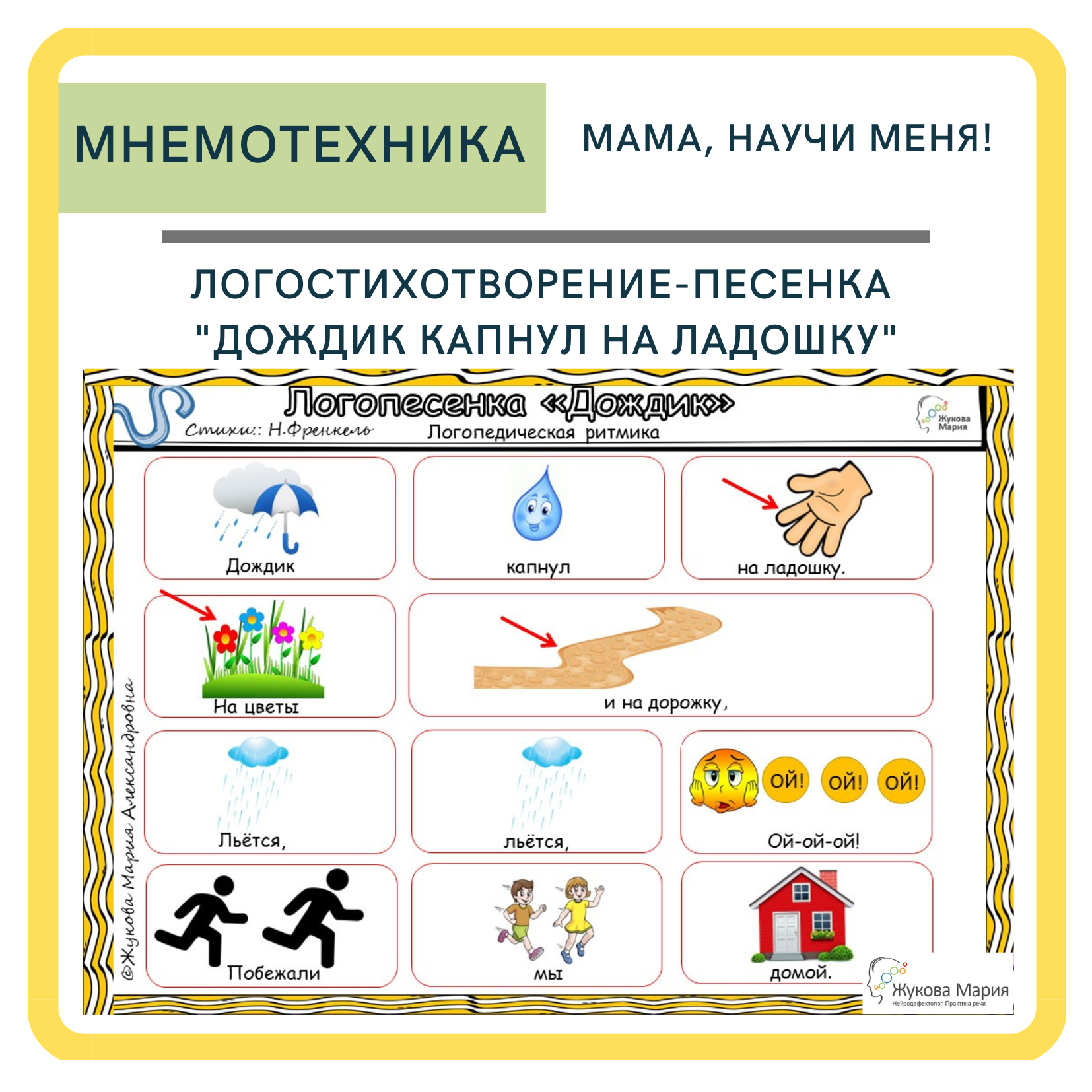 Представляю вашему вниманию мнемостихотворение- песенку "Дождик капнул на дорожку".