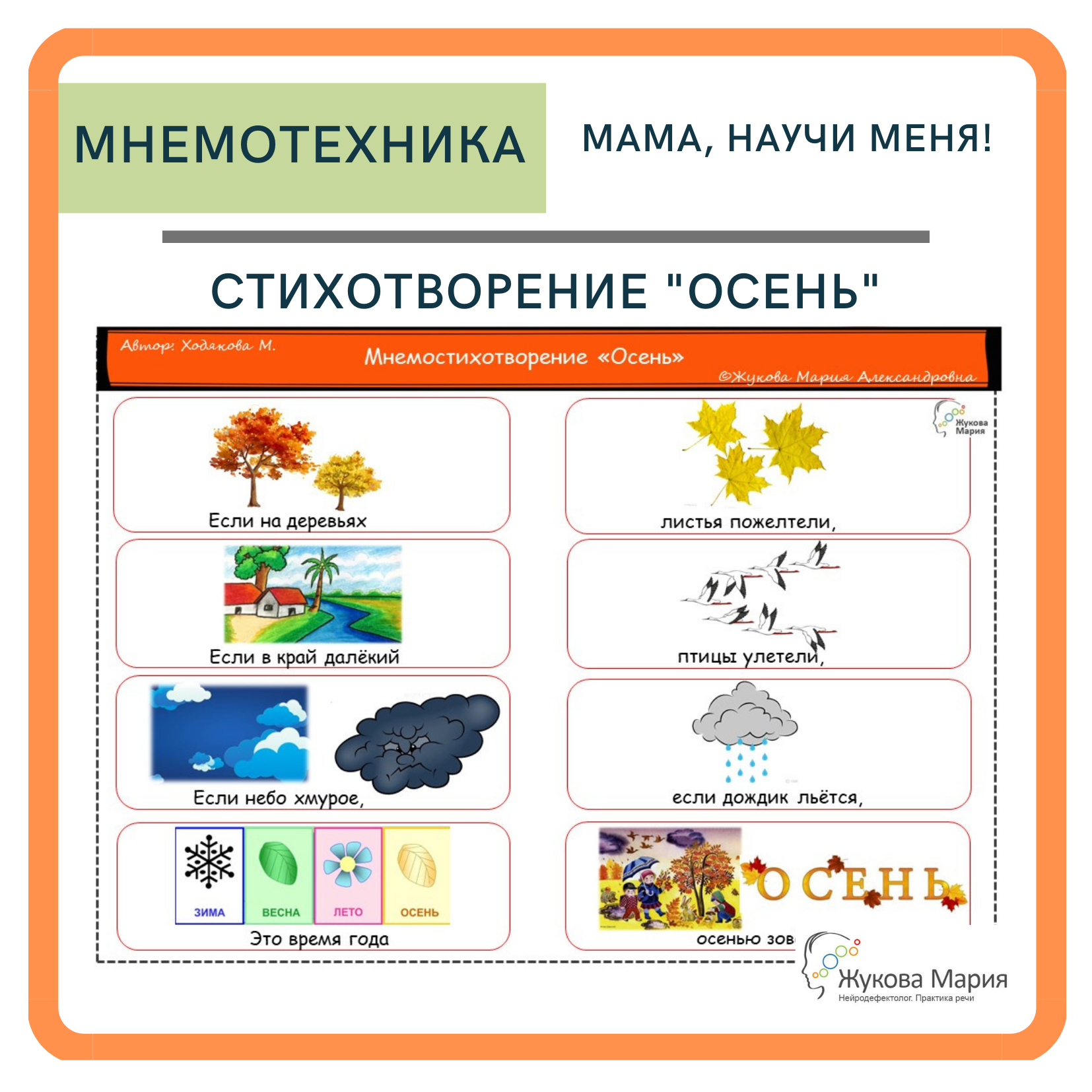 Предлагаю для заучивания мнемостихотворение «Осень». Это стихотворение короткое, легко учится. По силам для детей от 3 лет.