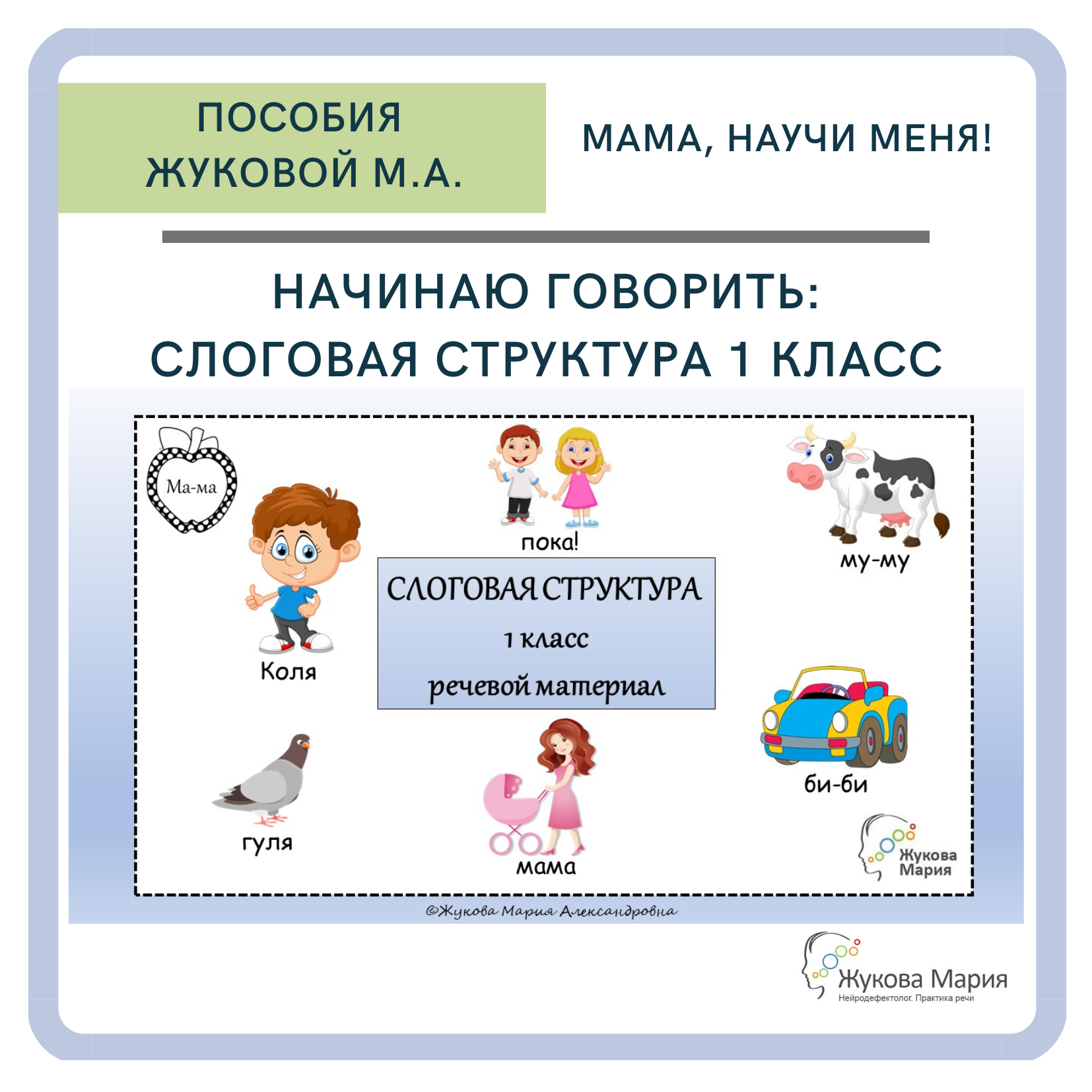 Предлагаю вашему вниманию моё дидактическое пособие из серии «Начинаю говорить»: «Слоговая структура. Первый класс. Речевой материал». Оно предназначено для родителей, которые хотели бы помочь своему ребёнку начать разговаривать.