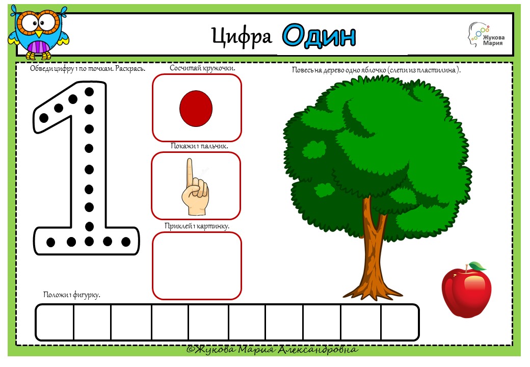 Это задание поможет ребенку всесторонне изучить цифру и число 1, сразу же применяя полученные знания на практике. Пособие проиллюстрировано соответствующим количеством изображений (одно дерево, один палец, одна точка, одно яблоко), следовательно, малыш может потренировать навыки счёта. Комплексный подход с использованием зрительной памяти и мелкой моторики позволит хорошо запомнить материал. Ребенку предлагается выполнить шесть различных действий, которые непосредственно связаны с «единицей». Благодаря такому плодотворному труду он сможет лучше усвоить материал и получит возможность развивать важные навыки: мелкую моторику, графомоторику (навыки письма), зрительно-моторную координацию и произвольное внимание. К тому же ребенок будет тренировать и поведенческие навыки, которые непременно будут ему полезны в дальнейшем обучении – усидчивость, усердие, терпение и целеустремленность.