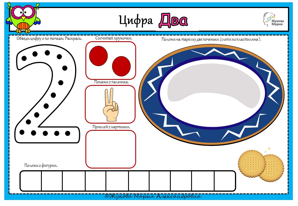 Предлагаю вашему вниманию моё пособие "Цифра 2". Это задание поможет ребенку всесторонне изучить цифру и число 2, сразу же применяя полученные знания на практике. Пособие проиллюстрировано соответствующим количеством изображений (два пальца, две точки, два печенья), следовательно, малыш может потренировать навыки счёта. Комплексный подход с использованием зрительной памяти и мелкой моторики позволит хорошо запомнить материал. Ребенку предлагается выполнить девять различных действий, которые непосредственно связаны с «двойкой». Благодаря такому плодотворному труду он сможет лучше усвоить материал и получит возможность развивать важные навыки: мелкую моторику, графомоторику (навыки письма), зрительно-моторную координацию и произвольное внимание. К тому же ребенок будет тренировать и поведенческие навыки, которые непременно будут ему полезны в дальнейшем обучении – усидчивость, усердие, терпение и целеустремленность.